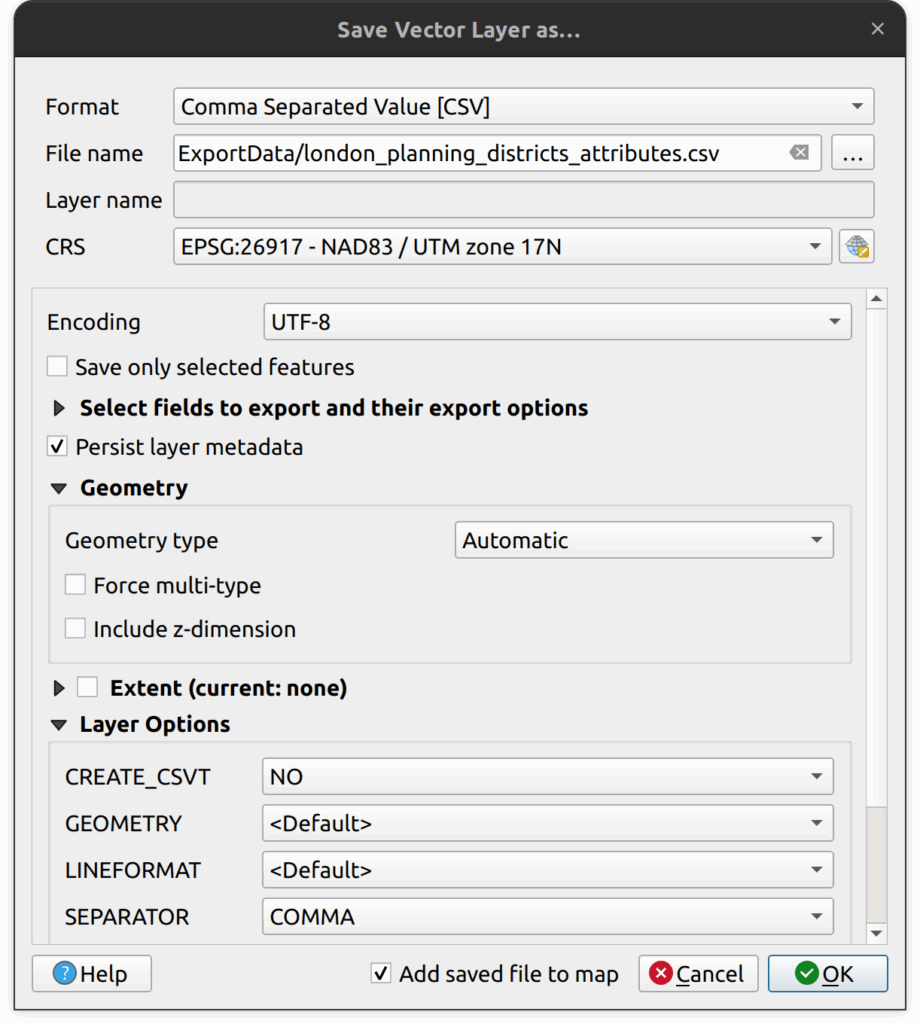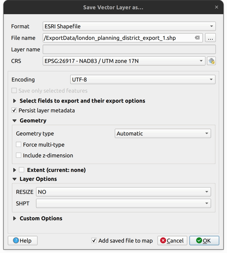 - For file name, select the tutorial folder as the destination and call the file london_planning_district_export_1.shp