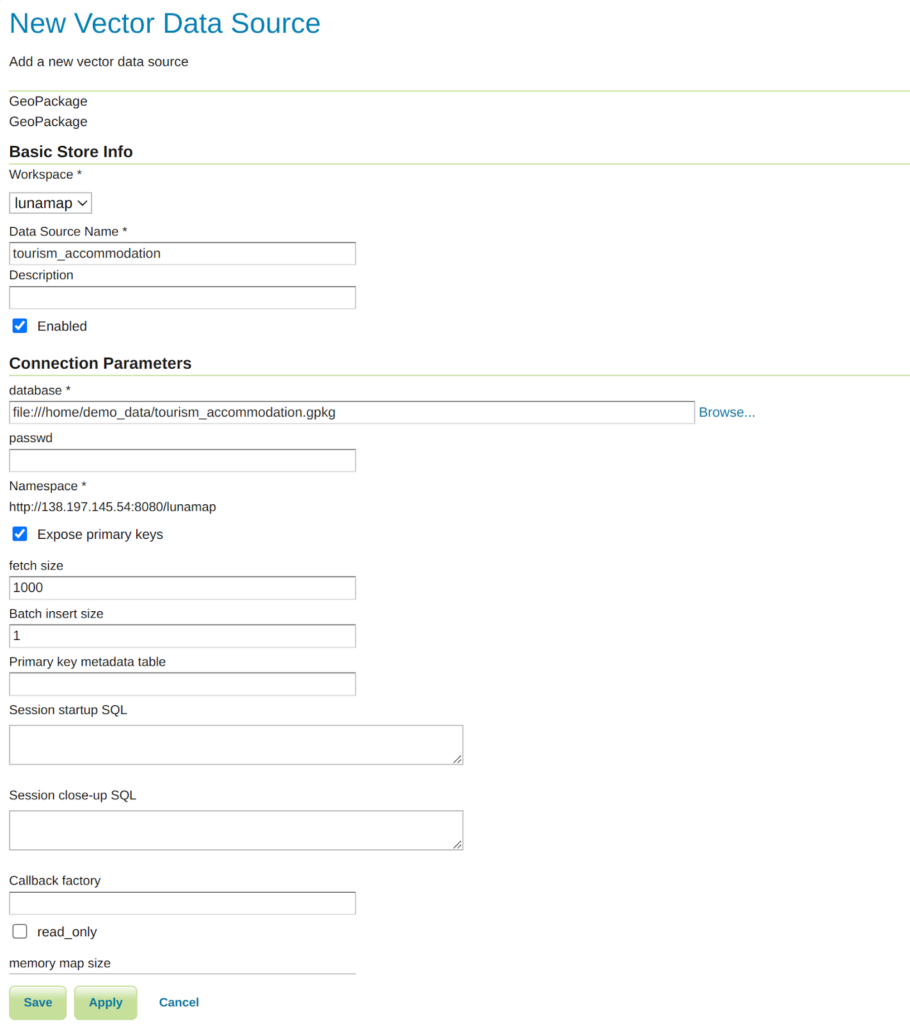 - Database: navigate to the location where the geopackage is stored on the server, and select the .gpkg file.