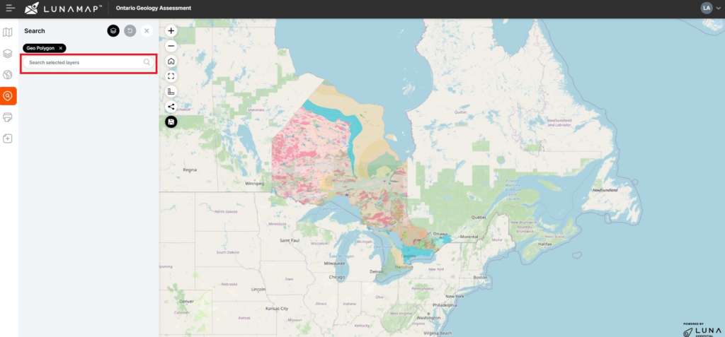 - In order to search a layer, the user must first select the searchable layer. Click the Select Layer icon at the top right of the search panel, then choose the layer from the list. Note that only visible layers will be available in the Search tool – i.e. a layer must be on to be searchable.