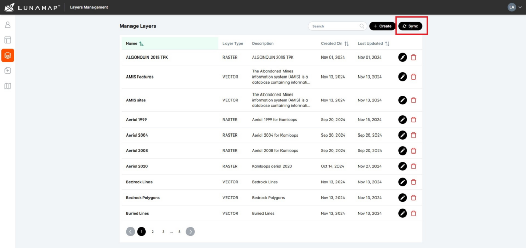 Manual synchronization is used to update existing layers in LunaMap. For example, if a new column was added to a layer, manual synchronization would add that new column to the LunaMap platform. Follow these instructions to trigger a manual synchronization: