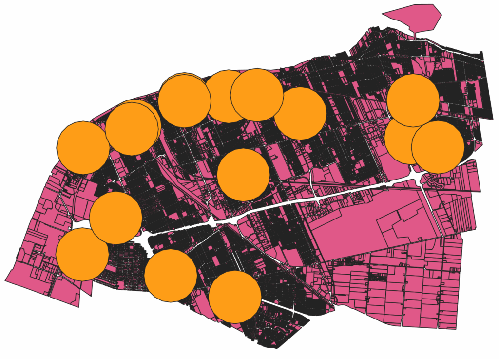 You should now see 1km circles around each community centre.