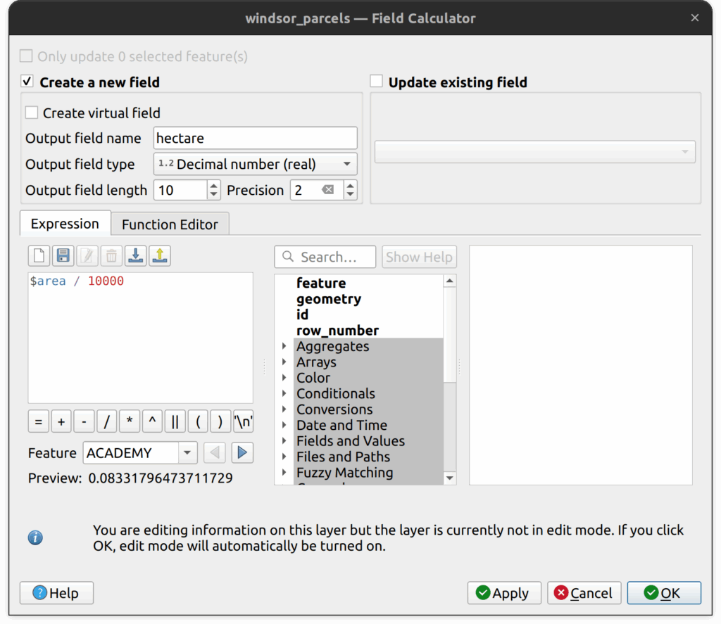Similar to the Select by Expression tool, we can use an expression to populate new field. In this example, you will create a new area field called hectare and calculate the area in hectares, which equals 10,000 square metres.