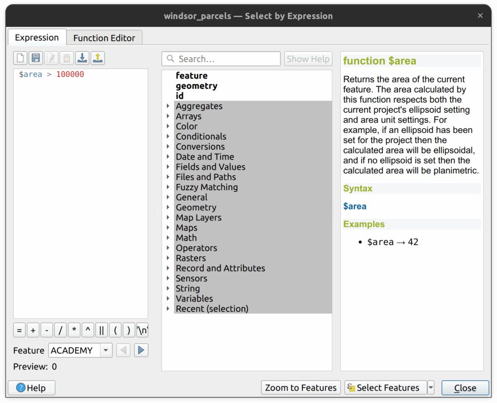 1. Under the geometry group, you can see all the functions available. Let’s use the $area function and find parcels larger than 100,000 square metres.