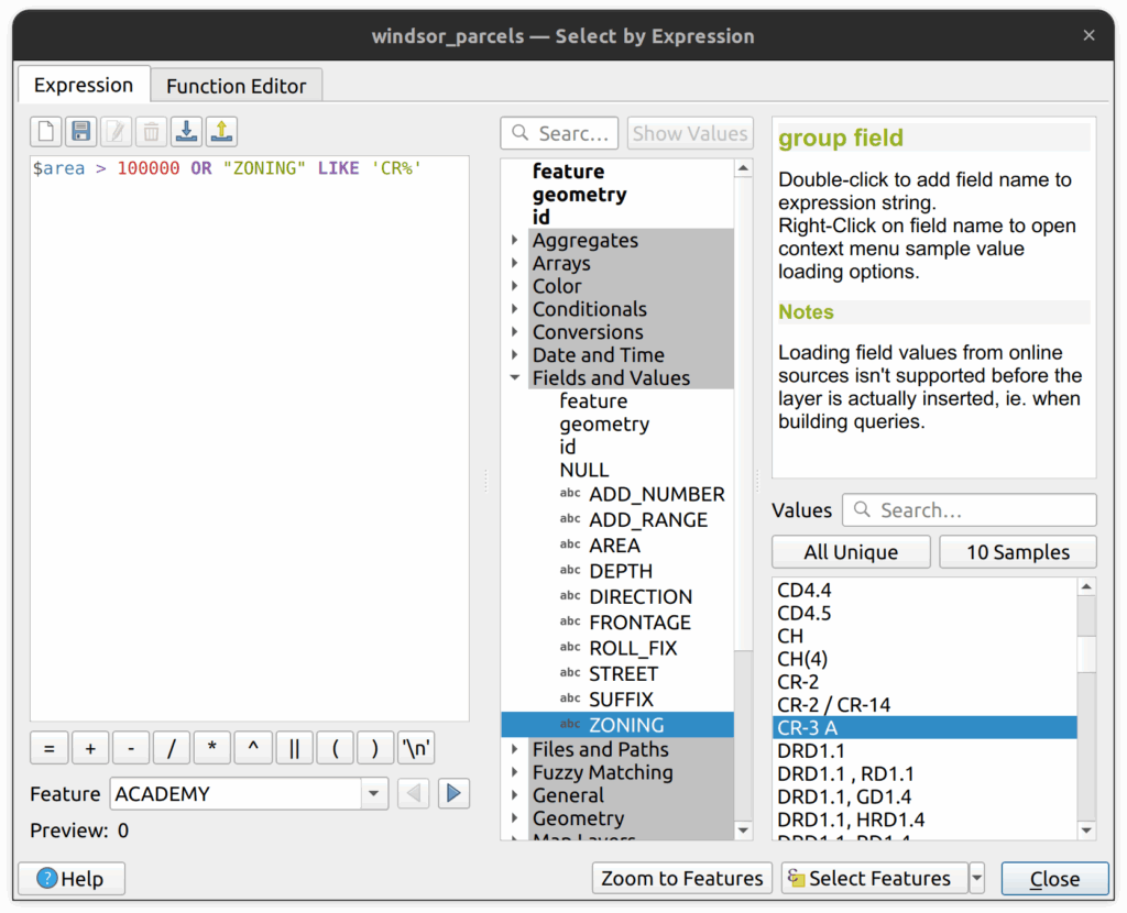 2. Select parcels that are larger than 100,000 sqm OR that have a zone that starts with the letter CR. The search query should be $area > 100000 OR “ZONING” LIKE ‘CR%’