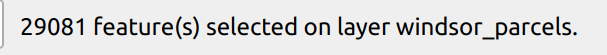View the count at the bottom of your QGIS interface or open the windsor_parcels attribute table to determine how many parcels were selected. It should be 29,081.
