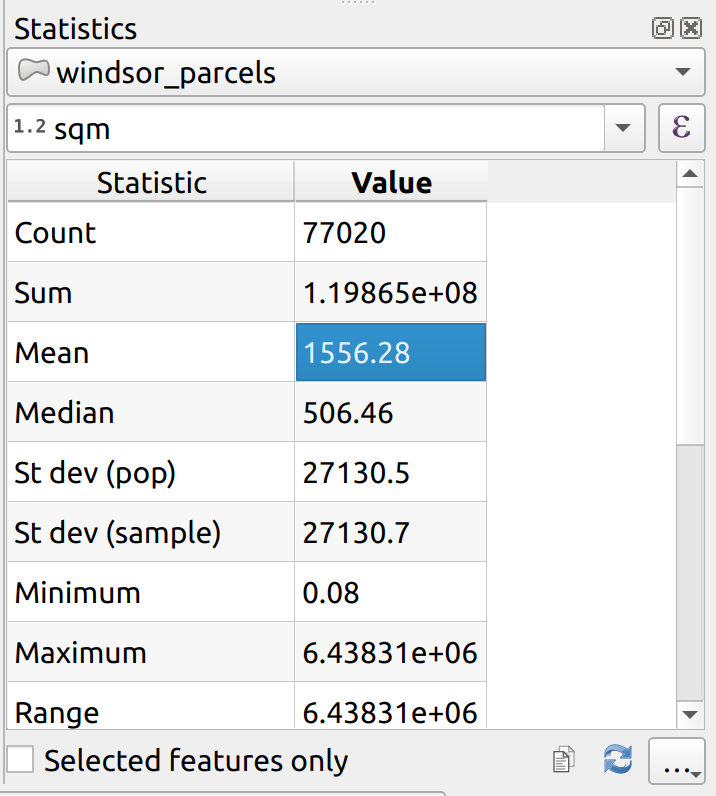 2. With windor_parcel layer selected, select the new sqm field to calculate its statistics