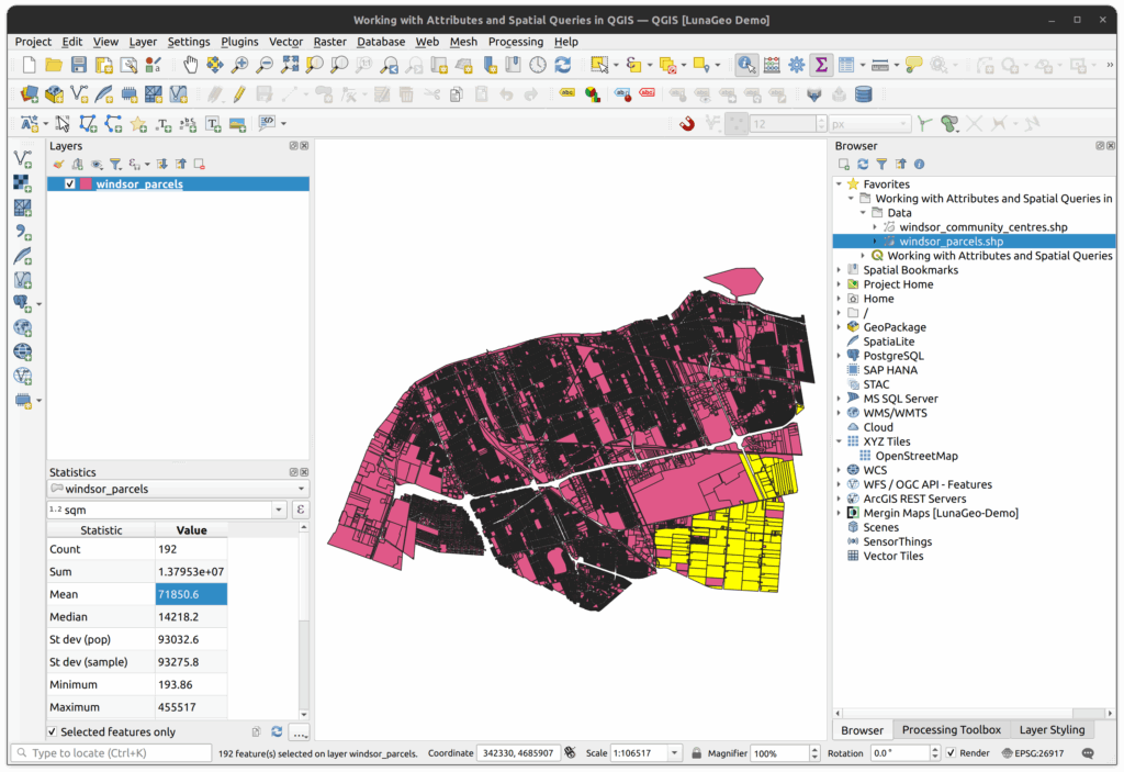 Explore Attributes Data in QGIS through hands-on querying, analysis, and spatial selection using real municipal parcel data from Windsor, Canada. This tutorial walks through practical workflows for selecting features based on attribute values, calculated geometry, and spatial relationships using tools like Select by Expression, the Field Calculator, and Select by Location. You’ll calculate new attributes, generate statistics, compare zoning categories, and export results for further analysis. By combining attribute-based queries with spatial logic, the tutorial demonstrates how QGIS can be used to extract meaningful insights from complex datasets rather than simply viewing table data.