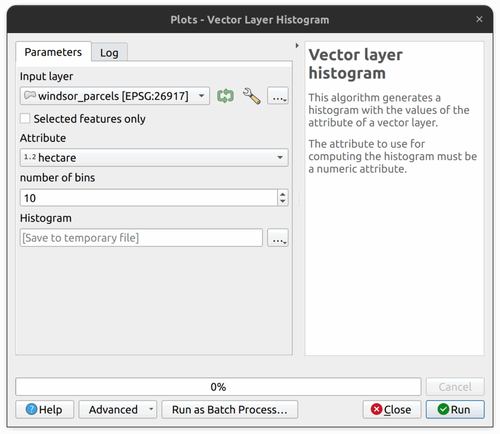 3. In the Vector Layer Histogram tool, enter the following parameters: