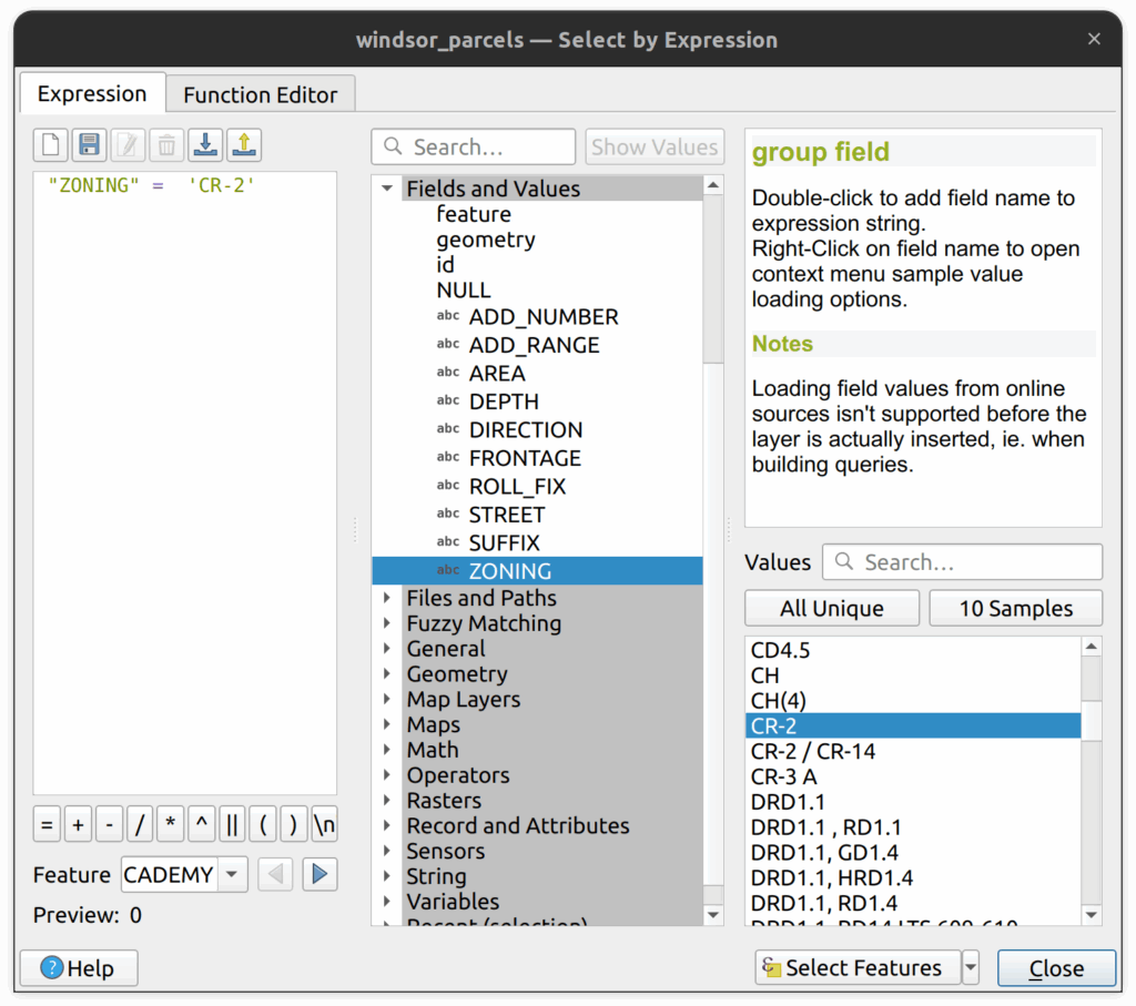7. In the middle of the Select by Expression tool, expand the Fields and Values header and select the ZONING field. Then in the area to the right, click the All Unique button to show all unique values in that field. These are the zoning codes for the City of Windsor. CR (inversely) stands for Rural Commercial. Search for “ZONING” = ‘CR-2’ by double clicking on the ZONING field, then enter the = sign, then double click on CR-2 under the unique values. There should be 2 results. Leaving the selection, close the Select by Expression window and minimize the Attribute table.